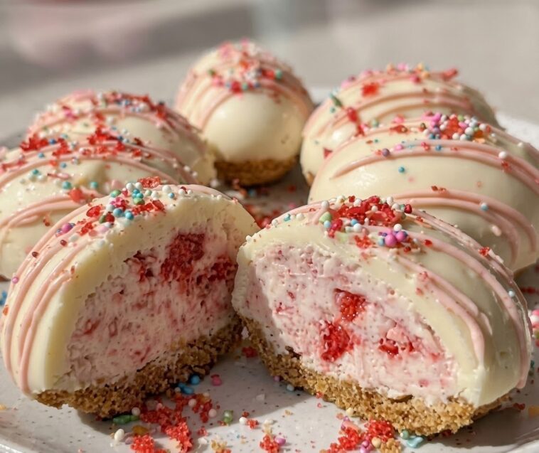 Made with crushed vanilla wafers and freeze-dried strawberries, these festive egg-shaped desserts capture the nostalgic flavor of strawberry shortcake in every bite.